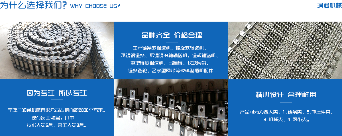 生產(chǎn)鏈條式輸送機(jī)、螺旋式輸送機(jī)、不銹鋼鏈條、不銹鋼滾軸輸送機(jī)、鏈板輸送機(jī)、重型鏈板輸送機(jī)、馬蹄鏈、長(zhǎng)城網(wǎng)帶、鏈條鏈輪、乙字型網(wǎng)帶等玻璃制瓶機(jī)配件,食品機(jī)械配件及各種網(wǎng)帶的專(zhuān)業(yè)廠家 ,多年來(lái)產(chǎn)品暢銷(xiāo)各地玻璃廠和食品廠,在玻璃制品等行業(yè)中享有較高的聲譽(yù)。公司集摸具開(kāi)發(fā)、機(jī)械設(shè)計(jì)生產(chǎn),銷(xiāo)售于一體的生產(chǎn)型企業(yè)。生產(chǎn)的自動(dòng)化流水線金屬傳動(dòng)網(wǎng)帶、鏈條等產(chǎn)品廣泛用于玻璃機(jī)械、食品機(jī)械、化纖機(jī)械、醫(yī)藥、電子、烘干機(jī)械、輪胎機(jī)械等行業(yè)。產(chǎn)品多銷(xiāo)往各個(gè)城市的機(jī)械廠、食品廠和一些涉及流水線或自動(dòng)化設(shè)備的公司。